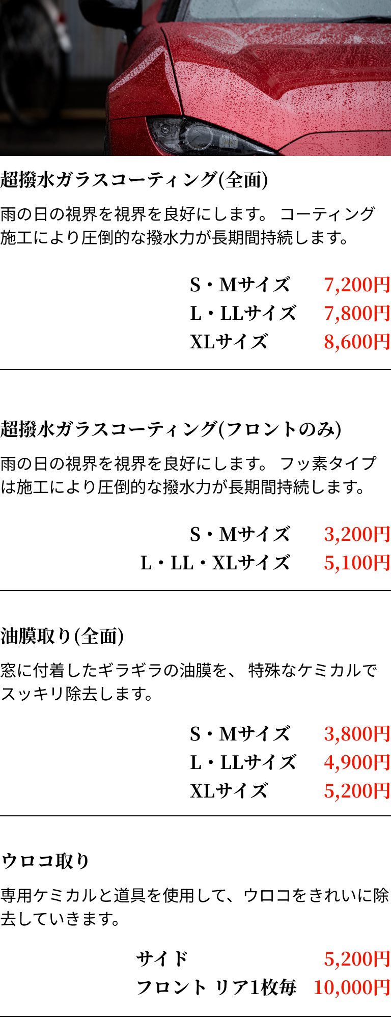 - ご安心ください。 ワックスや撥水コートが塗られると、表面はそのコーティングの性質を持つようになります。多くの場合、汚れやすくなり、艶が失われることがありますが、時間が経てば自然に落ちることもありますので、大きな心配は不要です。ただし、しつこく残るワックスもあるため、そのような場合には再施工をおすすめします。